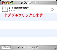 Expanderのウィンドウに、圧縮ファイルをマウスでドラッグ&ドロップします。 ※ダウンロード場所について Safariのダウンロードパネルに「伸張に失敗しました」と表示されますが、「ログインユーザー」フォルダの「ダウンロード」フォルダ内に圧縮されたファイルが保存されています。 詳しくはこちら |